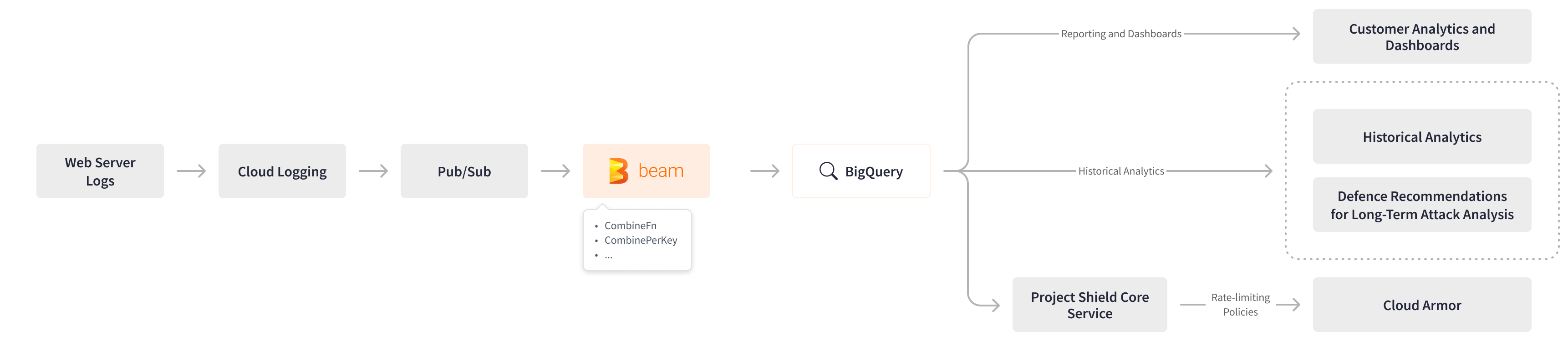 Project Shield extended the streaming Apache Beam log processing pipeline to generate a different type of report based on the logs and requests during attacks. The Apache Beam pipeline analyzes attacks and generates critical defense recommendations. These recommendations are then used by the internal long-term attack analysis system to fine-tune Project Shield’s defenses.