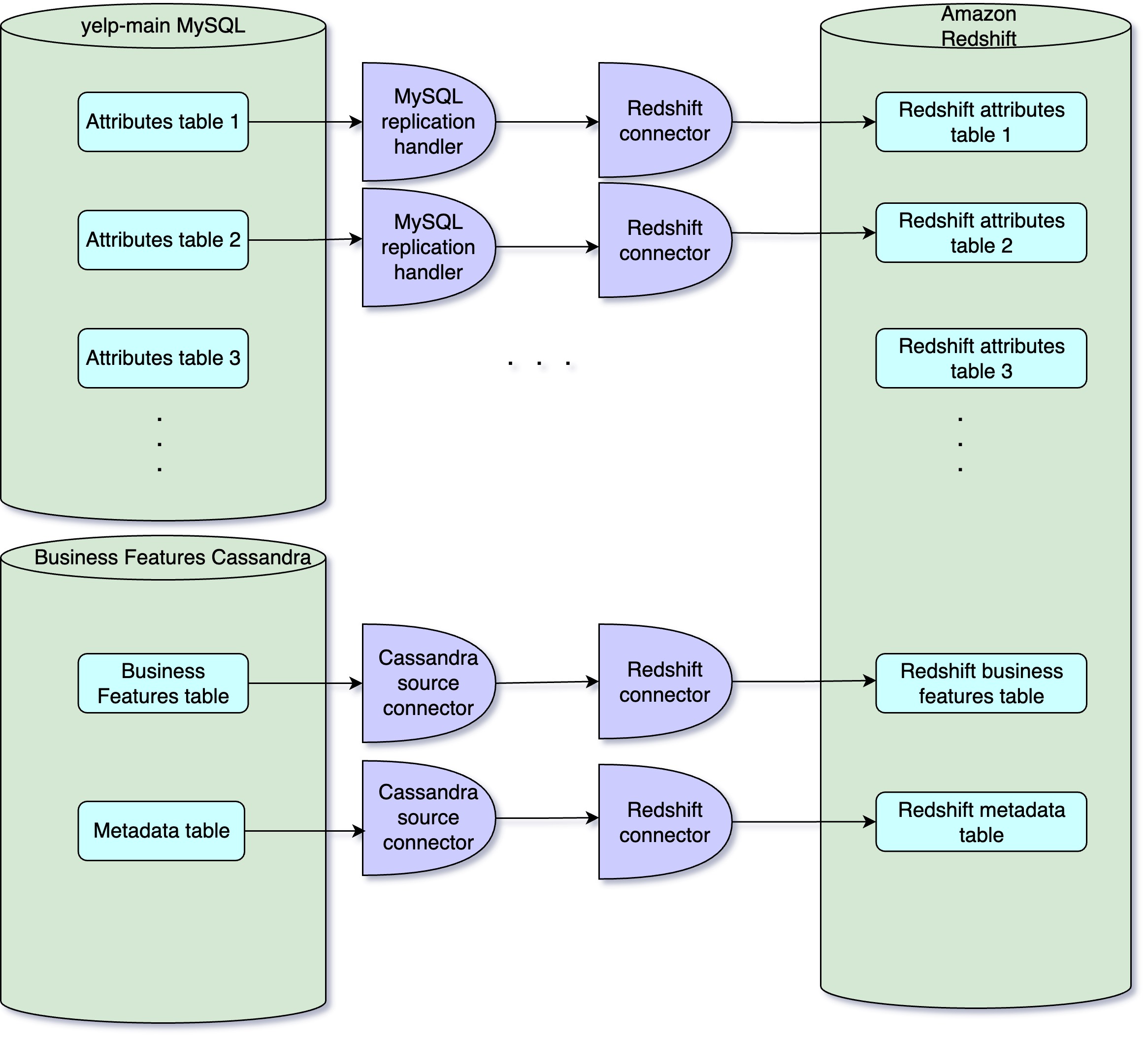 Offline data storage: the processed business properties data, complete with metadata, is made available for offline consumption and ends up in Redshift, through Redshift Connector. Additionally, it is ingested into Yelp’s Data Lake using a Data Lake connector, making it available for a broader range of analytics and data processing tasks