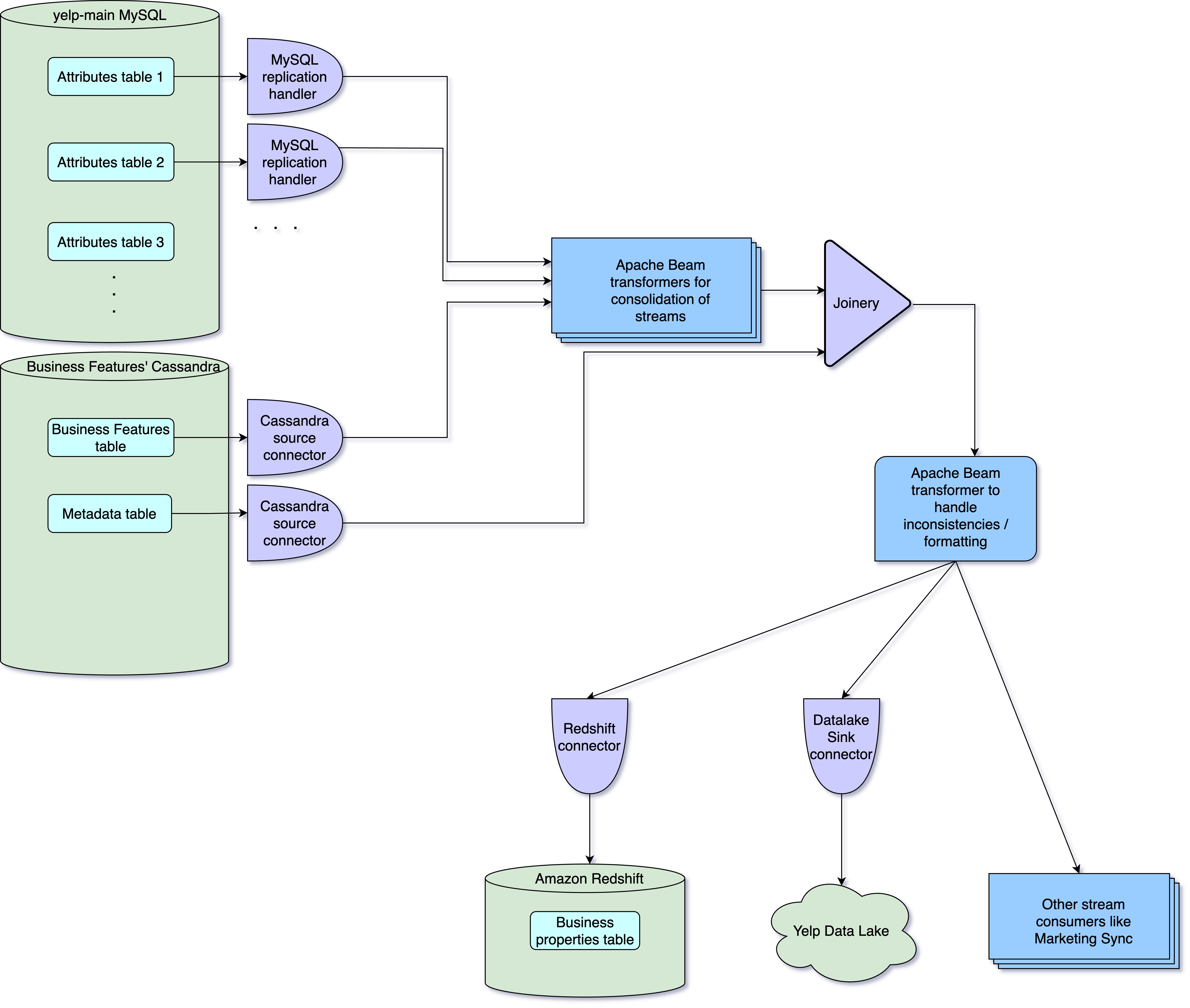 Business Attributes data collection and transformation: we utilize Apache Beam with Apache Flink as the distributed processing backend for data transformation and formatting Business attribute data. Apache Beam transformation jobs process data originating from various input streams generated by the MySQL replication handler. These streams contain replicated data from their corresponding MySQL tables. The transformation jobs are responsible for standardizing the incoming streaming data, transforming it into a consistent format across all business properties. The transformed data is then published into a single unified stream.